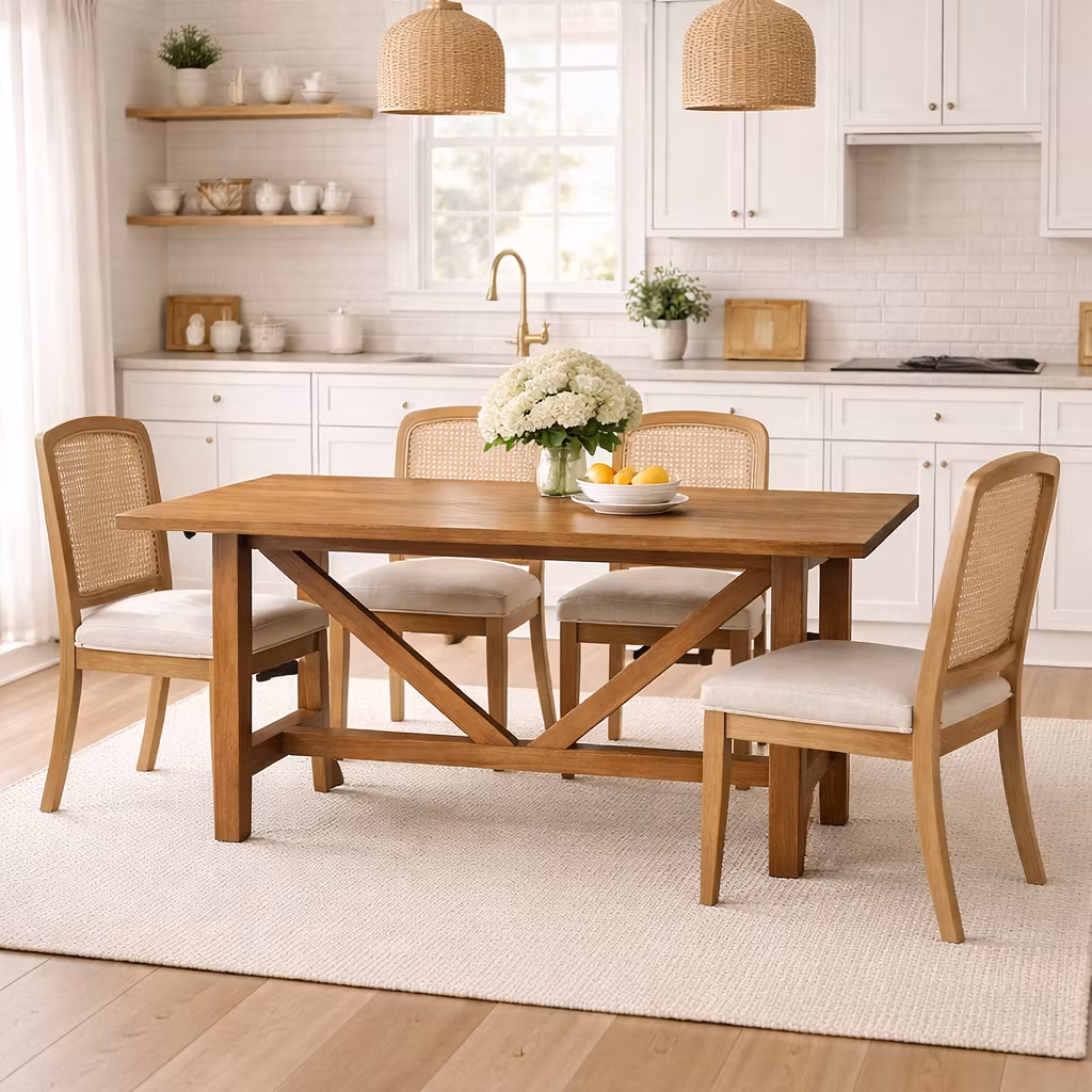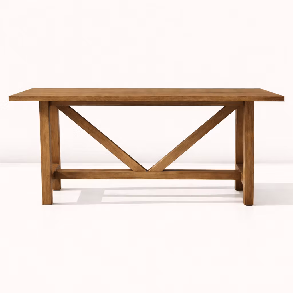 Byggt i massivt trä med stabil ram och dekorativt kryssunderrede som ger både hållfasthet och karaktär.