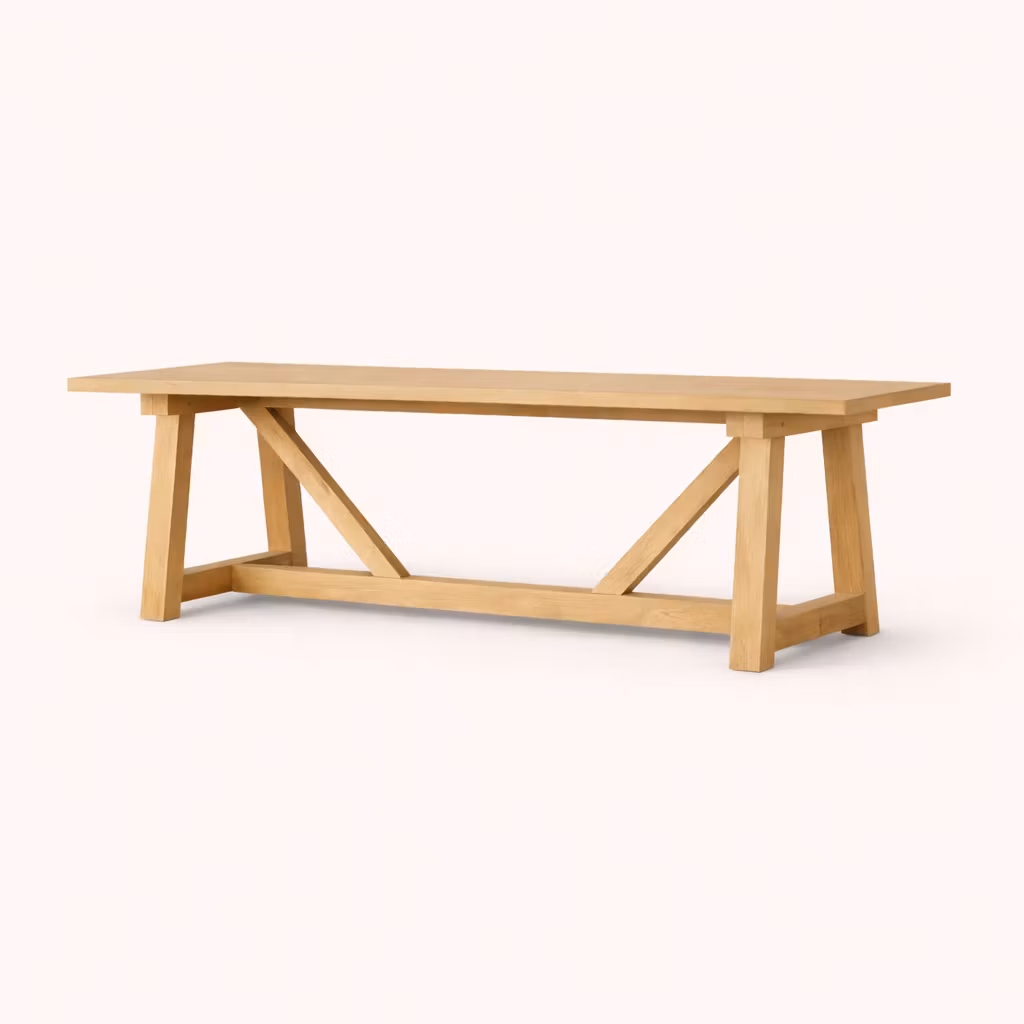 Tillverkas i ek, eller furu med stabil ram och karaktäristiska krysstag som ger både styrka och designuttryck. Vinklade ben lättar upp intrycket, trots lite grövre dimensioner. Den handbehandlade ytan framhäver träets naturliga struktur och ger en hållbar finish för dagligt bruk.