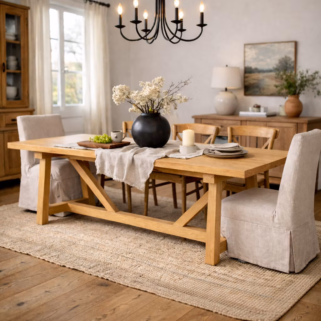 Modern farmhouse-stil där rustik värme möter rena, arkitektoniska linjer. Bordets balanserade form gör det till en naturlig mittpunkt i det samtida hemmet. Utstick på kortsidan medger lätt placering på kortsidan.